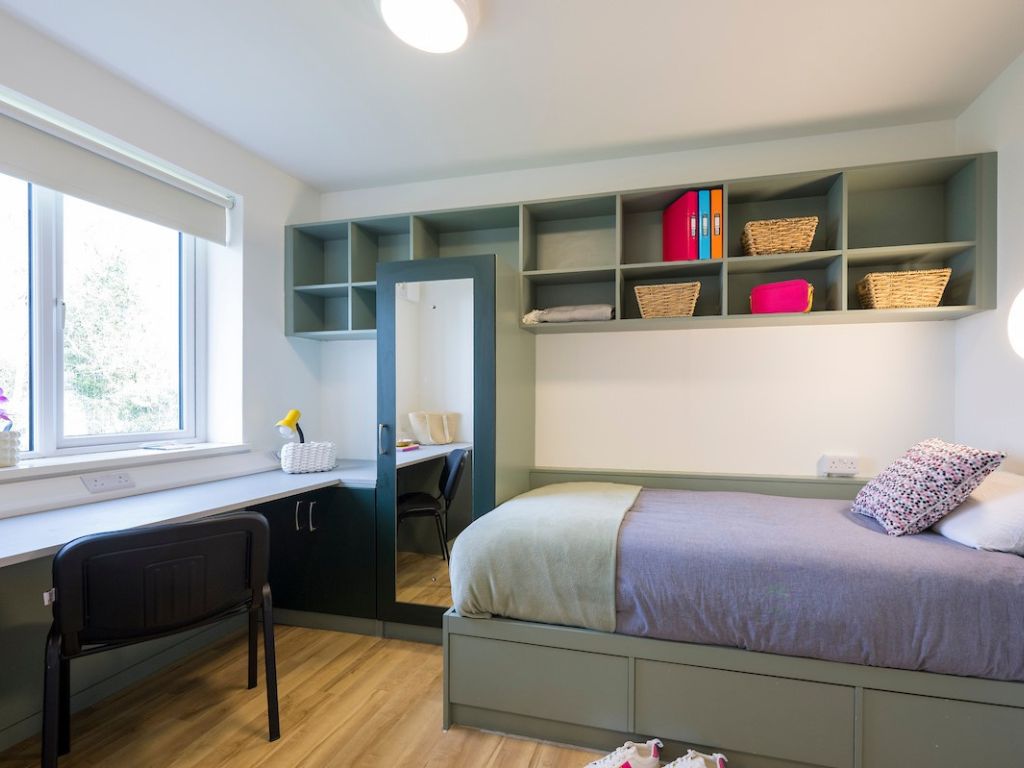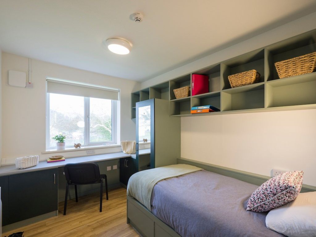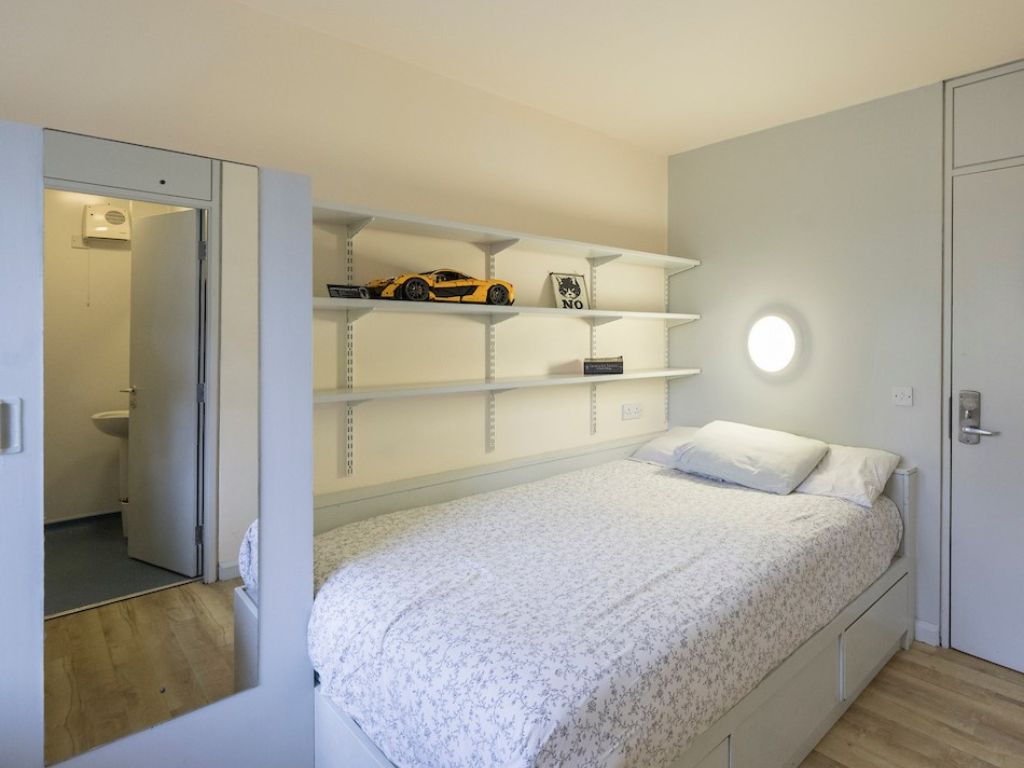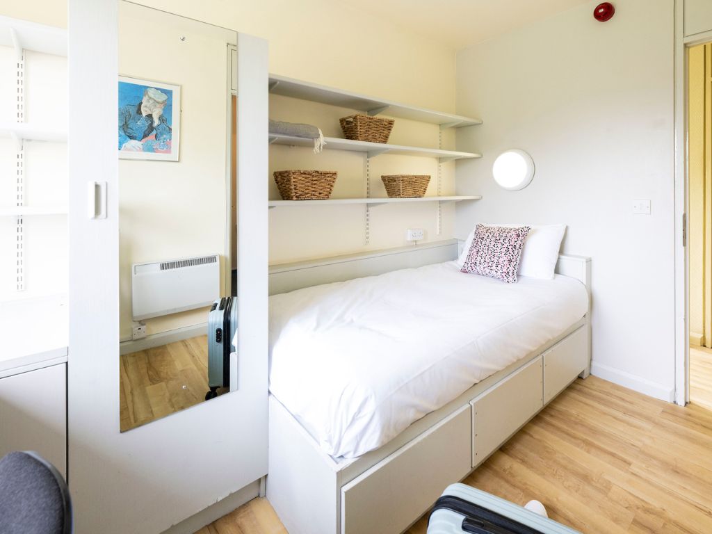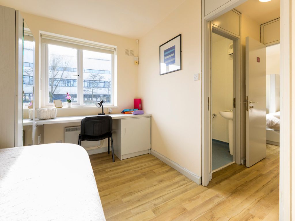 Private bedroom with a single bed, a study space and storage. The ensuite bathroom is shared with the student in the adjoining room. This apartment contains a kitchen and living area which you will share with 3 other students. Duvet, pillow and mattress protector supplied. This apartment has not yet been refurbished.
