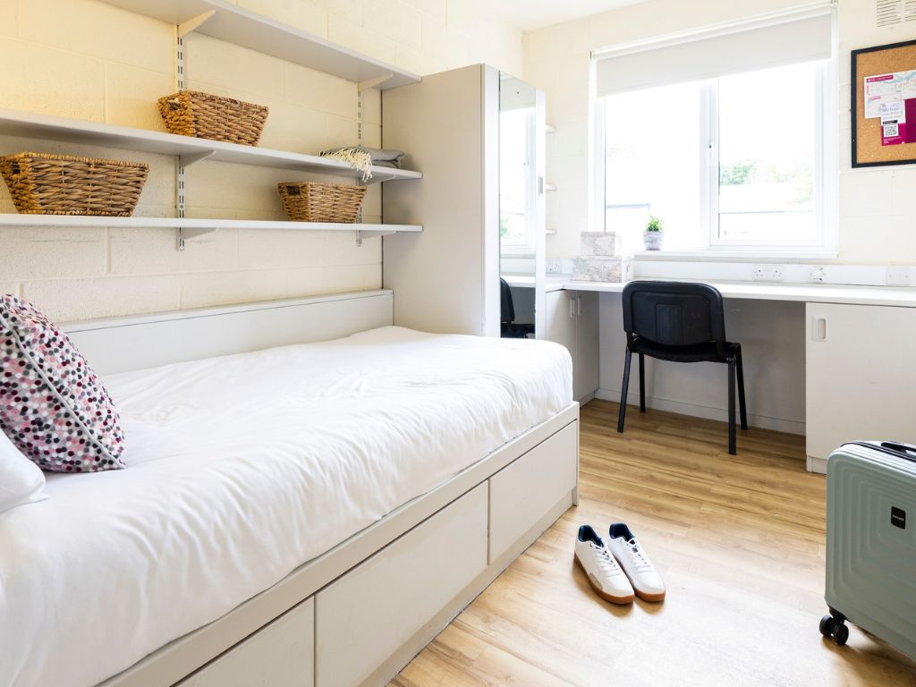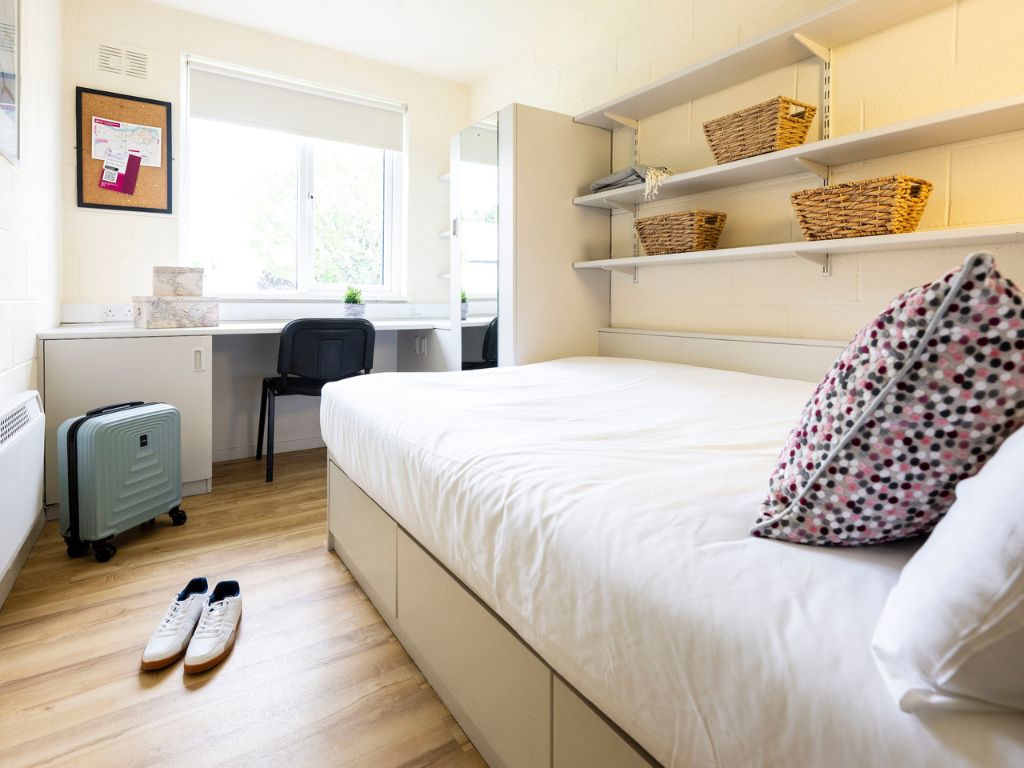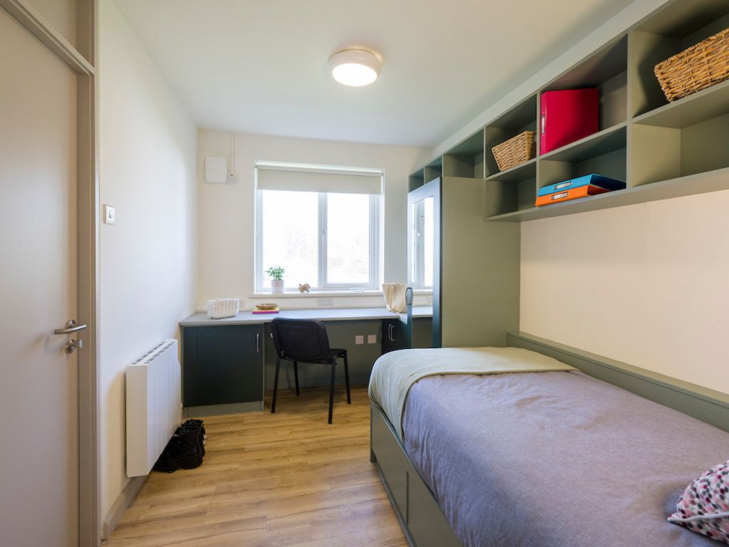 Private bedroom with a single bed, a study space and storage. This apartment contains a kitchen, living area and two bathrooms which you will share with 4 other students. Duvet, pillow and mattress protector supplied. This apartment has not yet been refurbished.