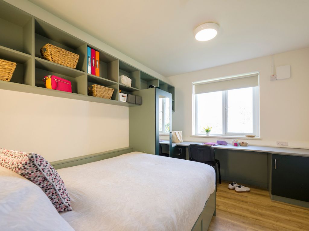 Private bedroom with a double bed, a study space and storage. This apartment contains a kitchen, living area and two bathrooms which you will share with 4 other students. Duvet, pillow and mattress protector supplied. This apartment has not yet been refurbished.