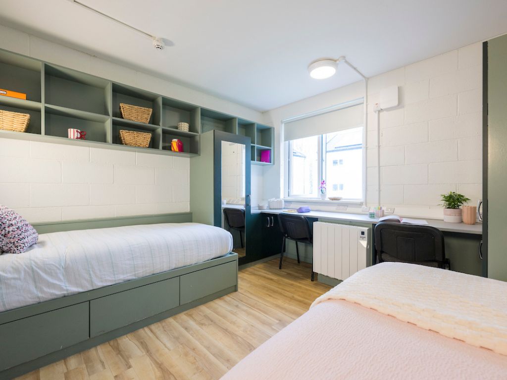 This room contains two single beds, a study space and storage. You will share this room with one other student. This apartment contains a kitchen, living area and two bathrooms shared between 5 students. Duvet, pillow and mattress protector supplied. This apartment has been refurbished. Building Energy Rating (BER) of A3 or higher.